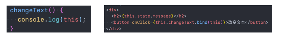 在类中直接定义一个函数,并且将这个函数绑定到元素的onClick事件上,当前这个函数的this指向的是谁呢? 默认情况下是undefined 。 很奇怪,居然是undefined; 因为在正常的DOM操作中,监听点击,监听函数中的this其实是节点对象(比如说是button对象); 因为React并不是直接渲染成真实的DOM,我们所编写的button只是一个语法糖,它的本质React的Element对象; 那么在这里发生监听的时候,react在执行函数时并没有绑定this,默认情况下就是一个undefined; 我们在绑定的函数中,可能想要使用当前对象,比如执行 this.setState 函数,就必须拿到当前对象的this 。我们就需要在传入函数时,给这个函数直接绑定this 类似于下面的写法: