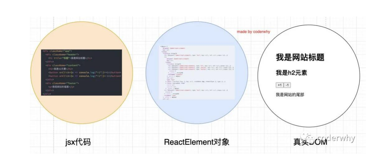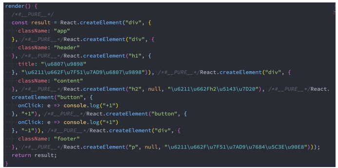 实际上,jsx 仅仅只是 React.createElement(component, props, ...children) 函数的语法糖。 所有的jsx最终都会被转换成React.createElement的函数调用。