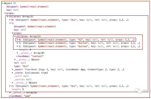 - 参数三:children ; 存放在标签中的内容,以children数组的方式进行存储; 当然,如果是多个元素呢?React内部有对它们进行处理,处理的源码在下方