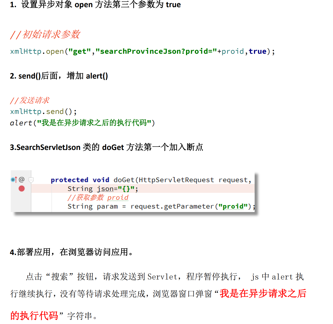实现步骤:同 1.4.3 步骤,需要 open(method,url,false)第三个参数设为 false
