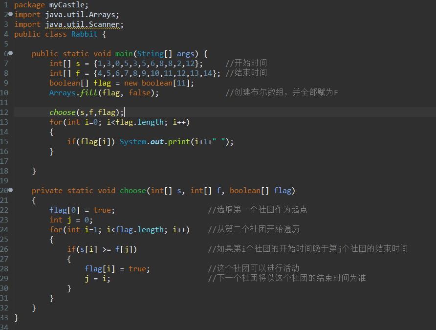 注意看,结束时间f[]是以正序排列的,从第0个元素开始恰好体现了贪婪算法的重要特征:鼠目寸光注重当下利益。面对还没有社团被批准的空空如也的社团,我们自然会认为应该把最早结束的社团活动放在最先考虑。上述代码还有可以优化的地方——如果数组f不是以正序排列呢?如果你有兴趣,不妨再加一个排序的方法来让你的程序更加完美。