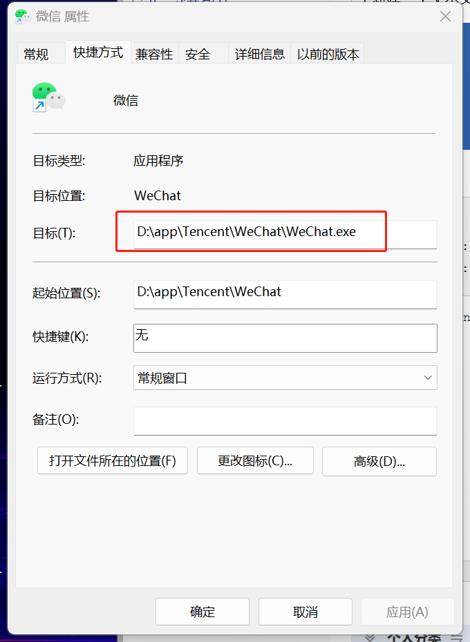 D:\app\Tencent\WeChat\WeChat.exe 为微信目标地址