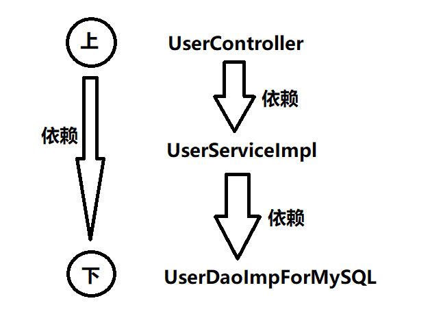 可以很明显的看出,上层是依赖下层的。UserController依赖UserServiceImpl,而UserServiceImpl依赖UserDaoImplForMySQL,这样就会导致下面只要改动,上面必然会受牵连(跟着也会改),所谓牵一发而动全身。这样也就同时违背了另一个开发原则:依赖倒置原则。