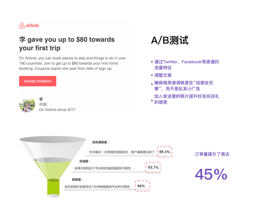 通过A/B测试,他们还有一个关于推介文案的结论:给用户展示“利他”的文案,比“利己”的更容易带来转化(激活+付费都是)。如图所示,告诉用户“邀请好友可以获得25美元”的效果就不如“给你的好友赠送25美元的旅行经费”更打动人。