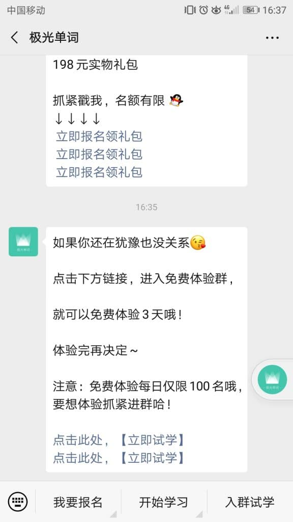 如果你领了红包之后也一直没有任何付费行动,极光单词公众号在首条自动回复的30分钟后再给你发一条消息,告诉你:犹豫也没有关系,这里可以免费体验。非常巧妙的挽回效果。是不是似曾相识?
