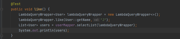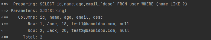 模糊匹配:like方法(包含指定字段)notLike(不包含指定字段)likeLeft(左边模糊,即%J)likeRight(右边模糊,J%)