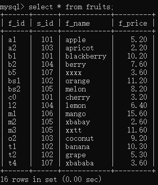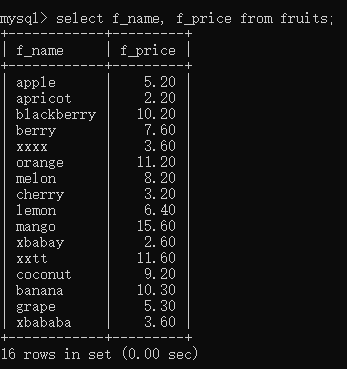 -- 2.查询指定字段-- 查询f_name和f_price字段的记录select f_name, f_price from fruits;