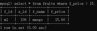 select * from fruits where f_price > 15;//将价格大于15的记录的所有字段都查询出来
