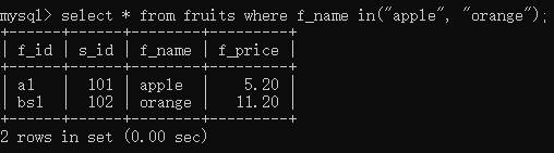 select * from fruits where f_name in('apple', 'orange');//f_name为apple或者orange的记录