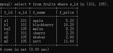 select * from fruits where s_id in(101, 105);//s_id为101或者105的记录