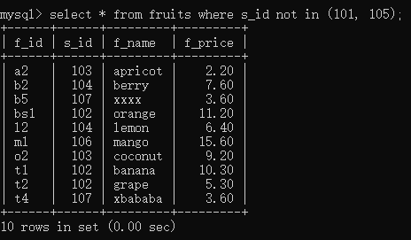 select * from fruits where s_id not in(101, 105);//s_id不为101或者105的记录