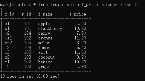 select * from fruits where f_price between 5 and 15;//f_price在5到15之间,包括5和15