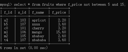 select * from fruits whete f_price not between 5 and 15;//f_price不在5到15之间