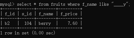 select * from fruits where f_name like'____y';//此处有四个_,说明要查询以y字母结尾并且y之前只有四个字符的记录