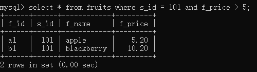 select * from fruits where s_id = 101 and f_price > 5;//同时满足s_id=101、f_price>5这两个条件才算匹配