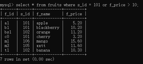 select * from fruits where s_id = 101 or f_ price > 10;//s_id=101或者f_price>10,只要符合其中一个条件,就算匹配