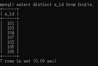 select distinct s_id from fruits;//将重复的值删除后,就只留下7条记录了