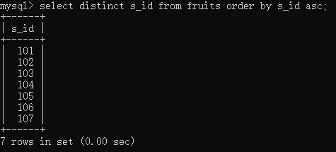 select distinct s_id from fruits order by s_id;//默认就是升序