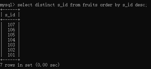 select distinct s_id from fruits order by s_id desc;//使用desc降序,也就是从高到低排列