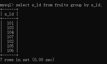 select s_id from fruits group by s_id;//将s_id进行分组,有实际意义,按批发商进行分组,从101批发商这里拿的水果都会放在101这个组中