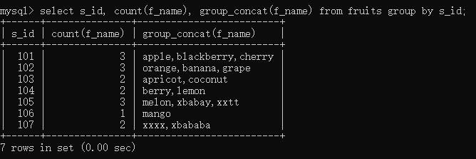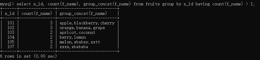 select s_id, count(f_name), group_concat(f_name) from fruits group by s_id having count(f_name) > 1;//他能够通过s_id分组,然后过滤出水果种类大于1的分组信息