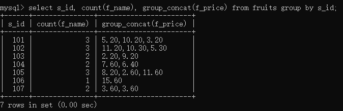 select s_id, count(f_name), group_concat(f_name), group_concat(f_price) from fruits group by s_id;