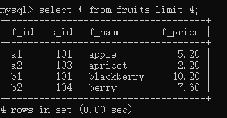 select * from fruits limit 4;//没有写位置偏移量,默认就是0,也就是从第一条开始,往后取4条数据,也就是取了第1条数据到第4条数据