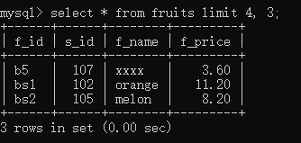select * from fruits limit 4, 3;//从第5条数据开始,往后取3条数据,也就是从第5条到第8条