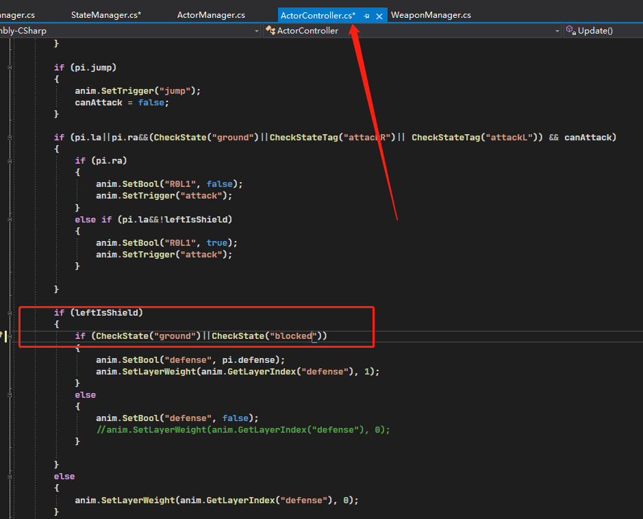 在更新函数里用这个变量去关联地面和格挡时可以使用的防御状态。