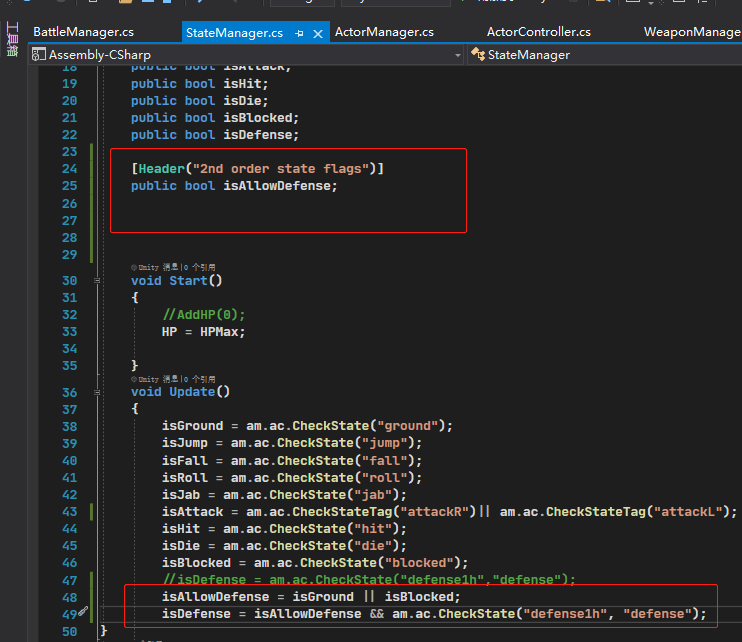 然后在StateManager新建一个二级旗标。新建一个全防御状态的布尔值。