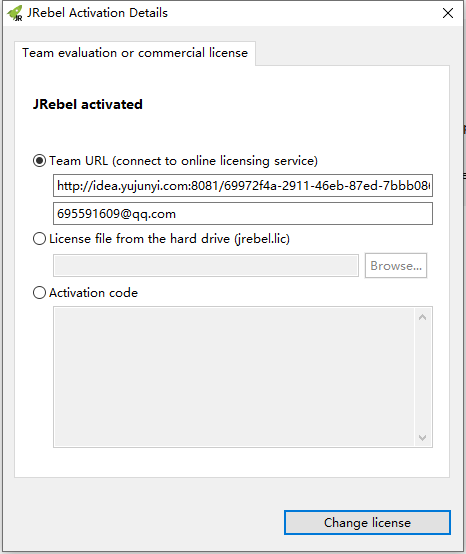 第一个输入框输入以上注册地址,第二个输入框输入个人邮箱地址即可,点击下面Change license按钮即可完成注册并关闭窗口。