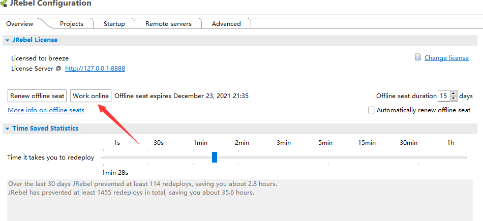 3.激活成功后,把work offline点一下