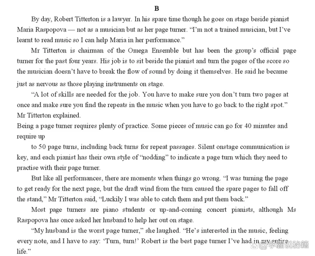 这里表明,翻页的人与表演者在舞台上的对话是无声的,更加需要练习的就是两人的默契,以及翻页的人对表演者肢体动作的观察能力,也就是their ownstyle of "nodding”因此选择只能选择B.Recognizing the"nodding。