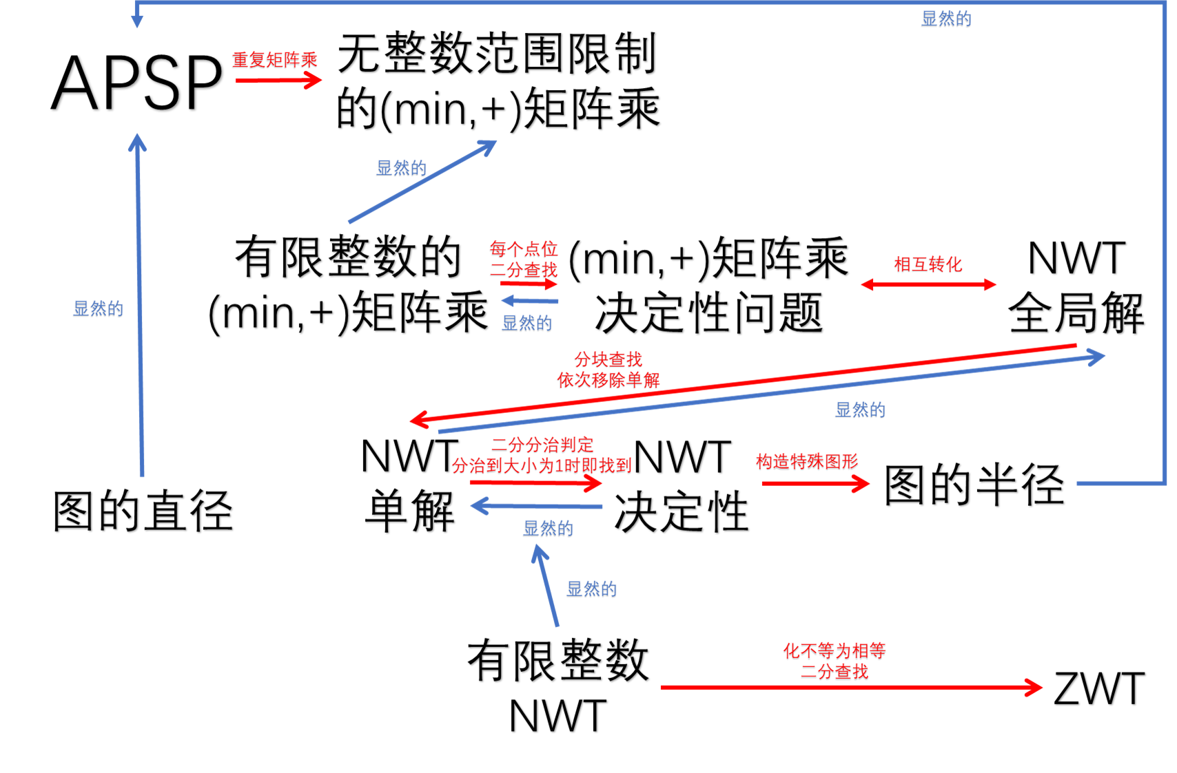 (博主注:1,若能归约$A\to B$,则$B$的(限定复杂度的)算法存在的条件较弱.2,原作者的证明有瑕疵,在有无整数范围限制的(min,+)矩阵乘和有无整数范围限制的NWT问题这里无法形成通路)