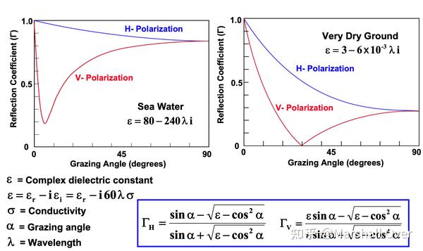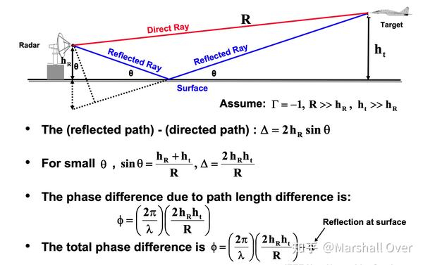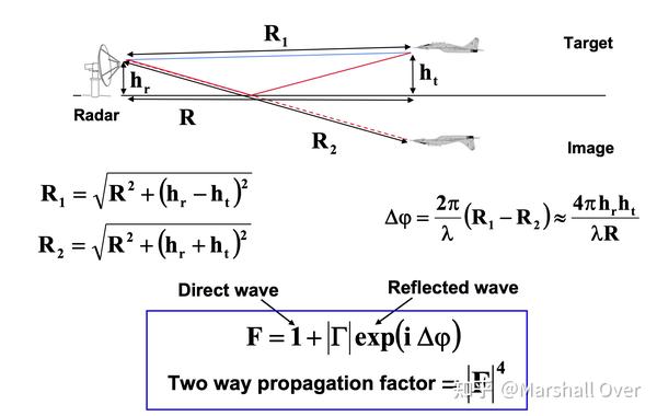 平面地球上的传播:地球表面的反射导致直接雷达信号与表面反射信号的干涉,由传播因子|F|^4表示的总传播效应。表面反射系数(Γ)决定相对信号振幅:取决于表面材料、粗糙度、极化、频率;对于平坦的海洋接近1,对于崎岖的陆地接近0。由路径长度差和反射时的相移确定的相对相位,取决于:高度、范围和频率。