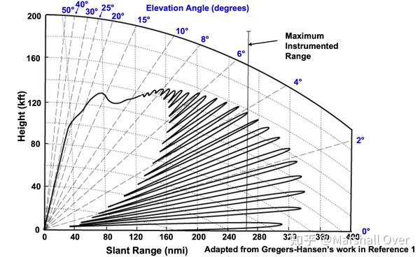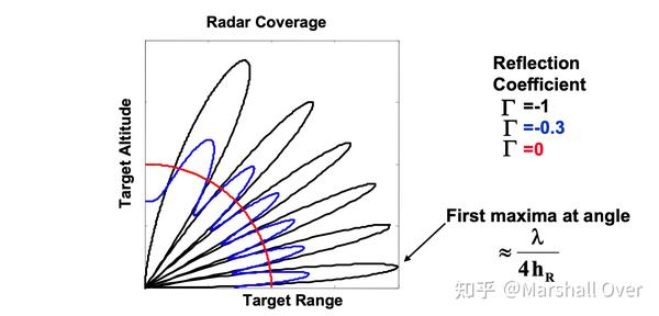 多径效应对雷达探测距离的影响:多路径导致高程覆盖被分解成一个叶形结构;位于波瓣最大值的目标将被探测到自由空间探测范围的两倍;在其他角度,检测范围将小于自由空间,零处不会接收到回波信号。