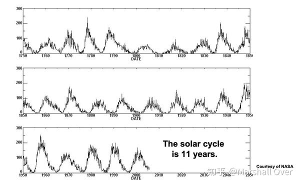 平均太阳黑子数(1750~至今):在每一周、每一个月、每一年中,太阳黑子数(太阳通量)都有显著变化,因此电离层中的电子密度也有显著变化。