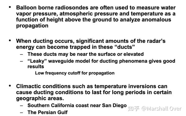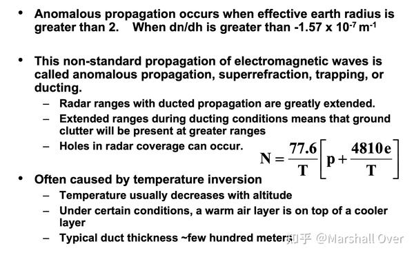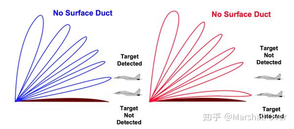 Effect of Ducting on Target Detection:可能造成雷达仰角覆盖范围的差距;可以在更大范围内进行低空飞机探测;增加来自地面的反向散射。