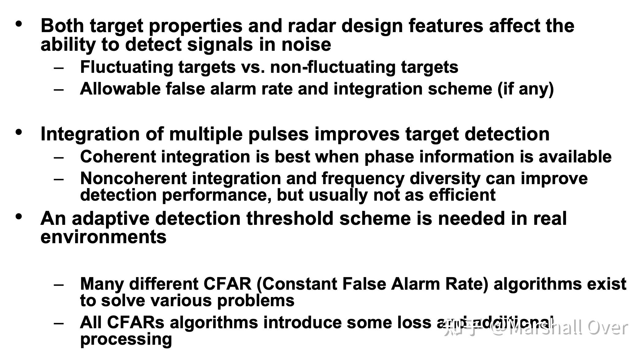 噪声中的目标检测:接收到的背景噪声随机上下波动,目标回波也会波动,两者都是随机变量;为了决定在给定范围内是否存在目标,我们需要设置一个阈值(常数或变量);检测性能(检测概率)取决于目标相对于噪声的强度和阈值设置。