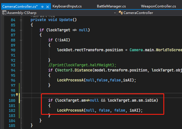 CameraController脚本里添加上这个代码,用来修改死亡后不被锁定: