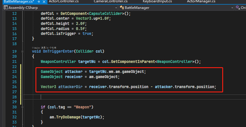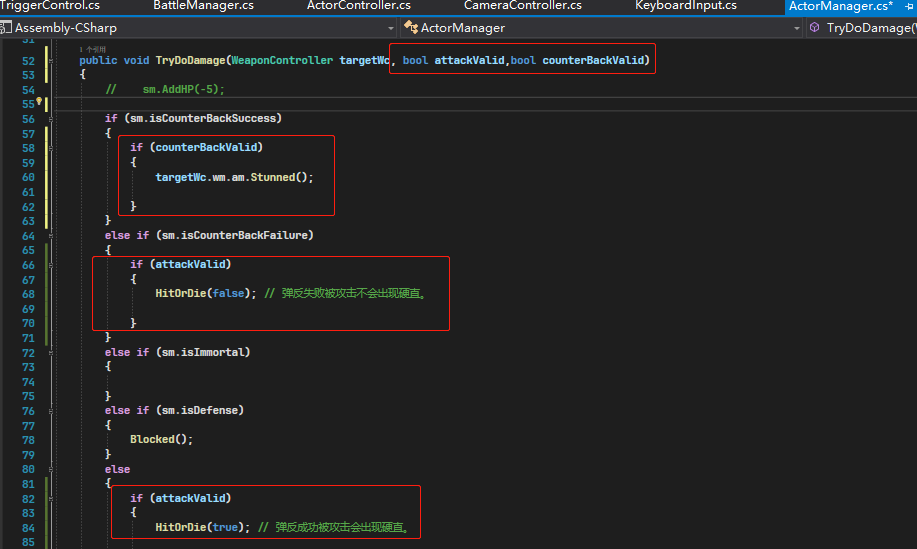 在ActorManager脚本里TryDoDamage函数新增几个布尔值判断攻击和背刺。