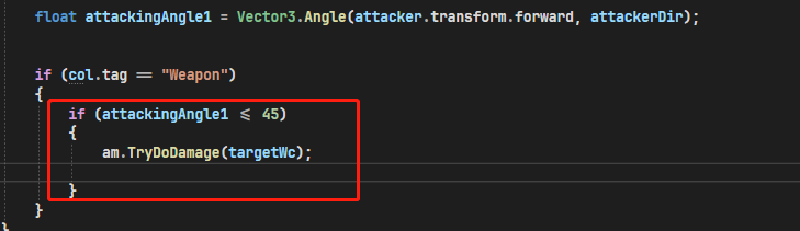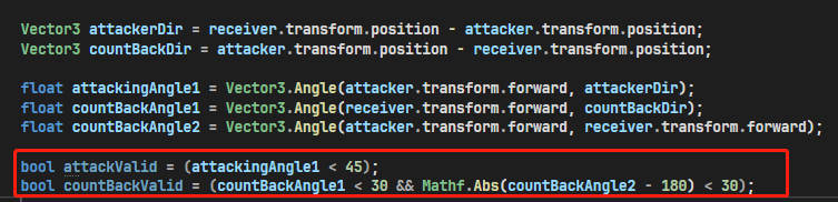 float attackingAngle1 = Vector3.Angle(attacker.transform.forward, attackerDir);