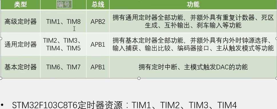 void Timer_Init(void) { RCC_APB1PeriphClockCmd(RCC_APB1Periph_TIM2, ENABLE); TIM_InternalClockConfig(TIM2); TIM_TimeBaseInitTypeDef TIM_TimeBaseInitStructure; TIM_TimeBaseInitStructure.TIM_ClockDivision = TIM_CKD_DIV1;//输入滤波ETRP那里使用,内部时钟分频多少 TIM_TimeBaseInitStructure.TIM_CounterMode = TIM_CounterMode_Up;//向上计数 TIM_TimeBaseInitStructure.TIM_Period = 10000 - 1; //ARR自动重装器的值? TIM_TimeBaseInitStructure.TIM_Prescaler = 7200 - 1; //PSC 预分频器的值 //目标频率=CK_PSC/(psc+1)/(ARR+1) 这里定时1S TIM_TimeBaseInitStructure.TIM_RepetitionCounter = 0; //重复计数器的值 (高级定时器才有,不用的话给0) //这里没有计数器的值,后期可以使用SetCounter和GetCounter函数来操作 TIM_TimeBaseInit(TIM2, &TIM_TimeBaseInitStructure); TIM_ClearFlag(TIM2, TIM_FLAG_Update); //?? 用来避免初始化完就立刻进中断, //因为写的预分频器的值只有在更新事件时起作用,为了立刻起作用,就手动生成一个事件 //同时更新事件和更新中断同时发生,当上电后自动触发一次中断,所以计数会直接从1开始 //这里手动把中断标志位清除一下,避免刚初始化完就进中断的问题 TIM_ITConfig(TIM2, TIM_IT_Update, ENABLE); //使用更新中断 开始到NVIC的通路 NVIC_PriorityGroupConfig(NVIC_PriorityGroup_2); NVIC_InitTypeDef NVIC_InitStructure; NVIC_InitStructure.NVIC_IRQChannel = TIM2_IRQn; NVIC_InitStructure.NVIC_IRQChannelCmd = ENABLE; NVIC_InitStructure.NVIC_IRQChannelPreemptionPriority = 2; NVIC_InitStructure.NVIC_IRQChannelSubPriority = 1; NVIC_Init(&NVIC_InitStructure); TIM_Cmd(TIM2, ENABLE); }
