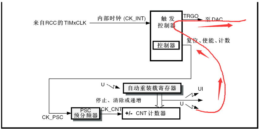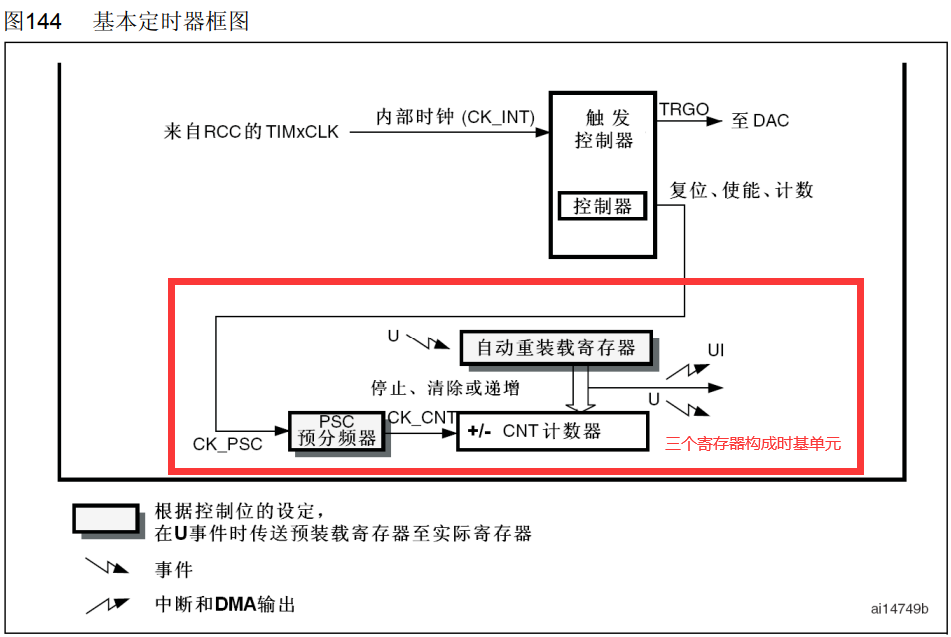 时基单元包括:PSC预分频器、CNT计数器、自动重装寄存器