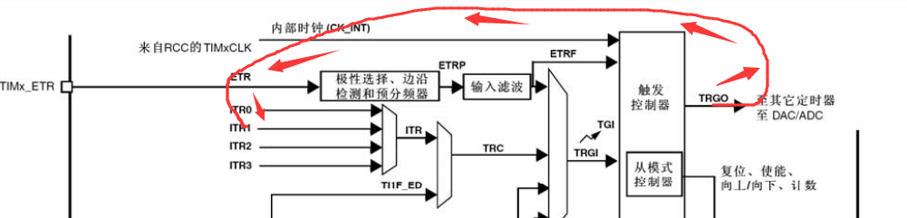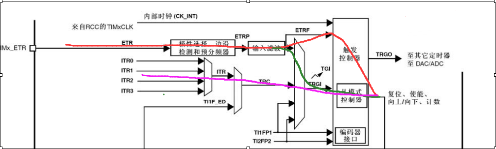 作为外部时钟使用的时候走上面ETRF那条路线的叫:外部时钟模式2 ; 走中间TRGI路线的叫:外部时钟模式1
