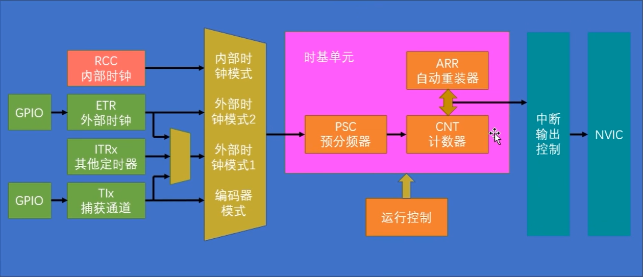 自动重装寄存器,写入需要计数的目标,达到这个计数就产生一个中断,并且清零计数器 。这个中断叫 “更新中断”,通往配置好的NVIC的定时器通道.同时还有产生的U“更新事件”,不能被CPU执行,可以被其他外设执行。