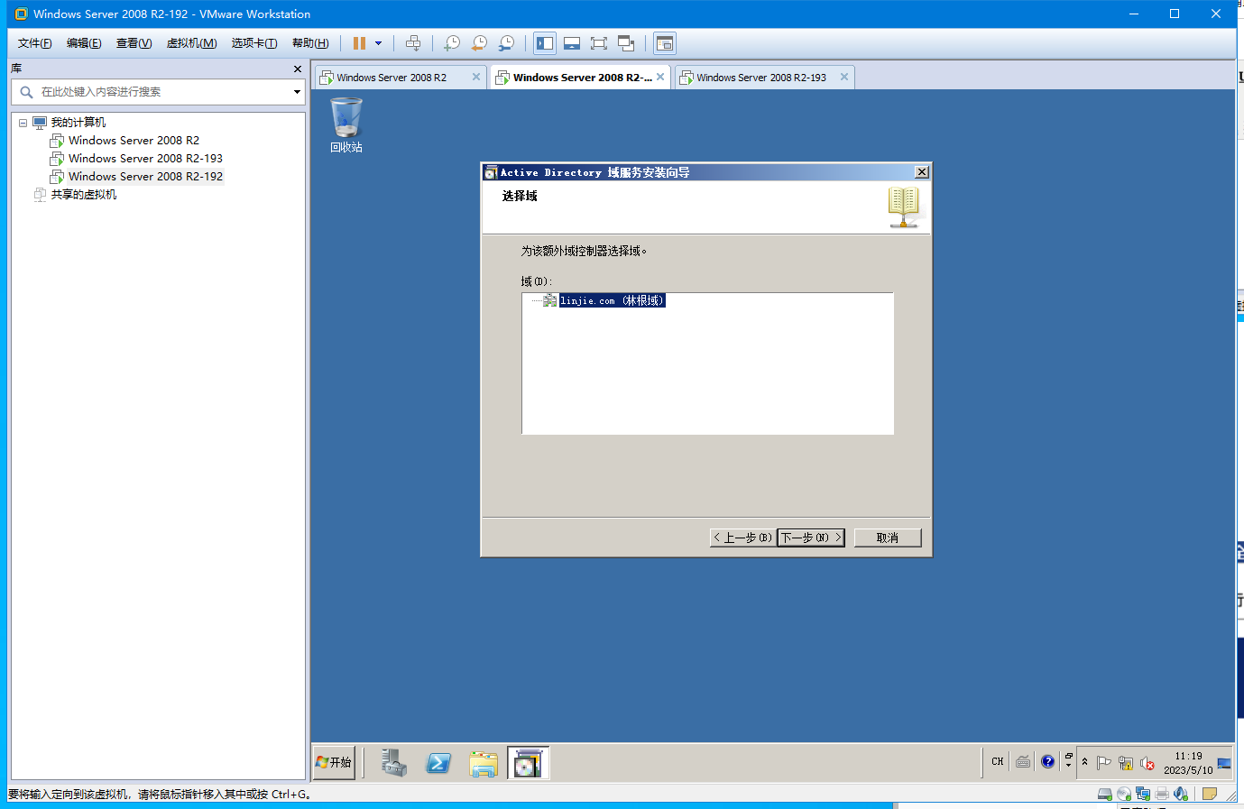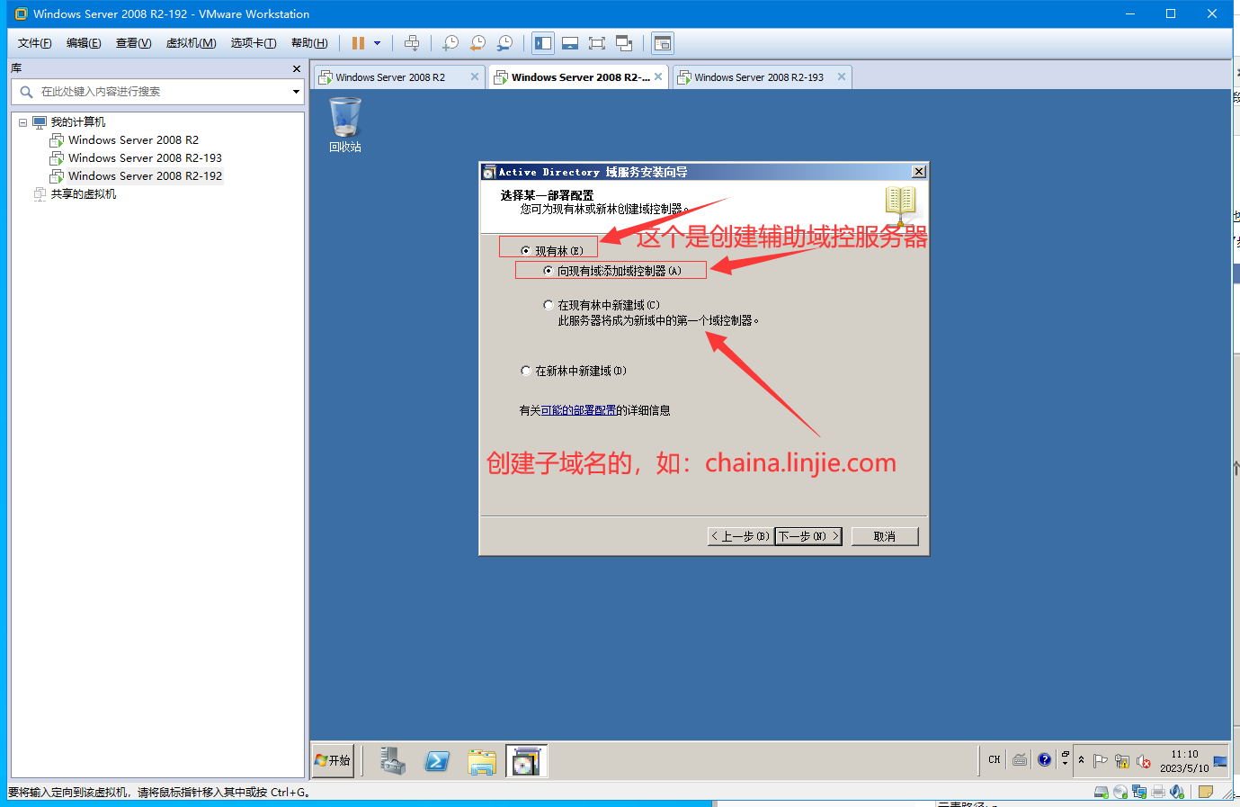 2、安装步骤参考主域控的安装步骤,注意再第7步骤时,选择-》现有林 下的-》向现有域添加域控制器” 再点击 下一步。(注意:选择-》现有林 -》向在现有林中新建域,表示新建子域名的,如:china.linjie.com)