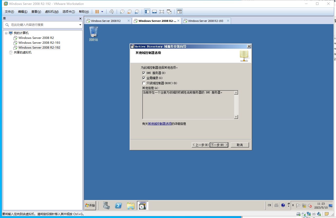 6、点击下一步,选择 DNS服务器和全局编录 点击下一步,(注意:只读域控制器,的作用是查看,不能操作,这个可以改指定的部门或者机构使用)