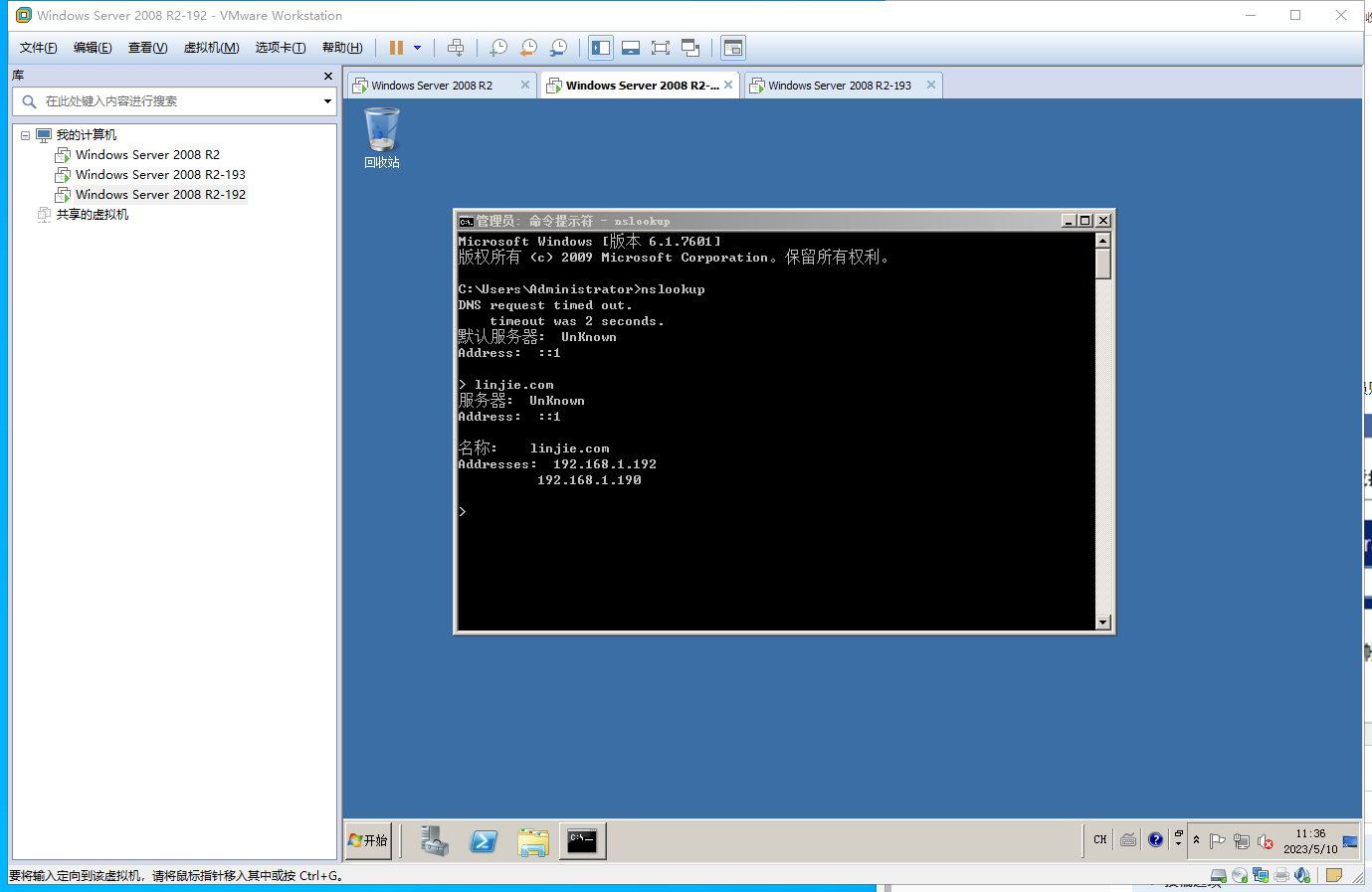 测试一下域名解析,可以看到比原来对了一个,现在2个IP(192.168.1.190,192.168.1.192)了,