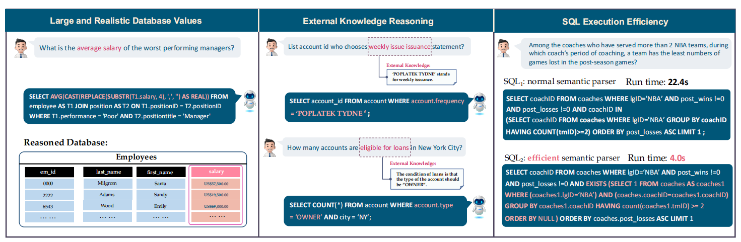 BIRD主要重视dirty content,external knowledge和SQL的效率三方面。